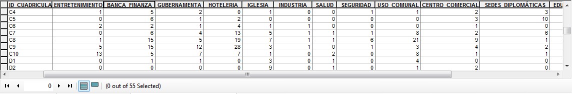 Description: La base de datos corresponde a la totalidad de servicios, instituciones y comercios que se ubican en el cantón San José y que están distribuidos y cuantificados por cada cuadrante. Descripción de los campos de su Base de DatosBANCA_FINANZA: La cobertura corresponde a las agencias bancarias y financieras.CENTRO_COMERCIAL: La cobertura corresponde a los centros comerciales.ENTRETENIMIENTO: La cobertura corresponde a las edificaciones donde se realizan actividades de cultura y entretenimiento.EDUCACIÓN: La cobertura corresponde a las instituciones educativas.ESTACIONES_SERVICIO: La cobertura corresponde a las estaciones de servicio.GUBERNAMENTAL: La cobertura corresponde a las instituciones gubernamentales.HOTELERIA: La cobertura corresponde a las edificaciones donde se brindan servicios de hospedaje.ID_CUADRICULA: Identificador único de cada cuadrante.IGLESIA: La cobertura corresponde a las edificaciones donde se brindan actividades religiosas.INDUSTRIA: La cobertura corresponde a las edificaciones donde se brindan servicios de industria.OBJECTID *: Campo del sistema.SALUD: La cobertura corresponde a las edificaciones donde se brindan servicios de salud.SEGURIDAD: La cobertura corresponde a las edificaciones donde se brindan servicios de seguridad.SEDES_DIPLOMÁTICAS: La cobertura corresponde a las edificaciones de las sedes diplomáticas.TOTAL_SERVICIOS: Total de edificaciones que brindan un servicio según cuadrante y categoría.USO_COMUNAL: La cobertura corresponde a las edificaciones donde se brindan servicios comunales.